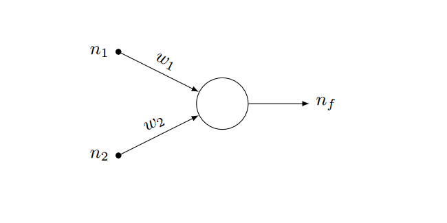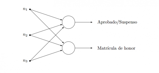 En nuestro ejemplo, las entradas serían las dos notas de los exámenes. Si la salida es uno (esto es, la suma de las notas por su peso correspondiente es mayor que cinco), es un aprobado. Si es cero, suspenso (Desaprobado). Los pesos son lo que tenemos que encontrar con el entrenamiento. En este caso, nuestro entrenamiento consistirá en empezar con dos pesos aleatorios (por ejemplo, 0.5 y 0.5, el mismo peso a cada examen) y ver qué resultado da la red neuronal para cada alumno. Si falla en algún caso, iremos ajustando los pesos poco a poco hasta que esté todo bien ajustado.
